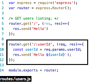 - 주소 중 변수로 사용하고 싶은 주소는 :로 지정한다. ( : 는 여러개 올 수 있다. )