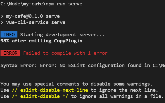 [Vue.js] Syntax Error: Error: No ESLint configuration found in You may use special comments to disable some warnings. vue eslint-disable-next-line 에러 해결