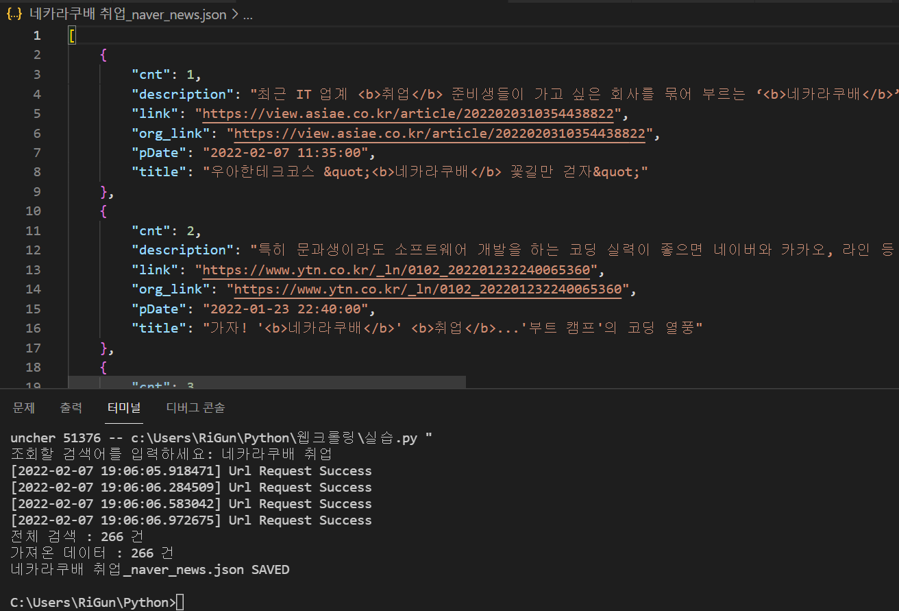 # 터미널 상에서 원하는 검색어 입력하면 데이터 조회후 같은경로에서 JSON 파일(데이터 파일) 생성