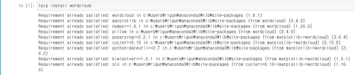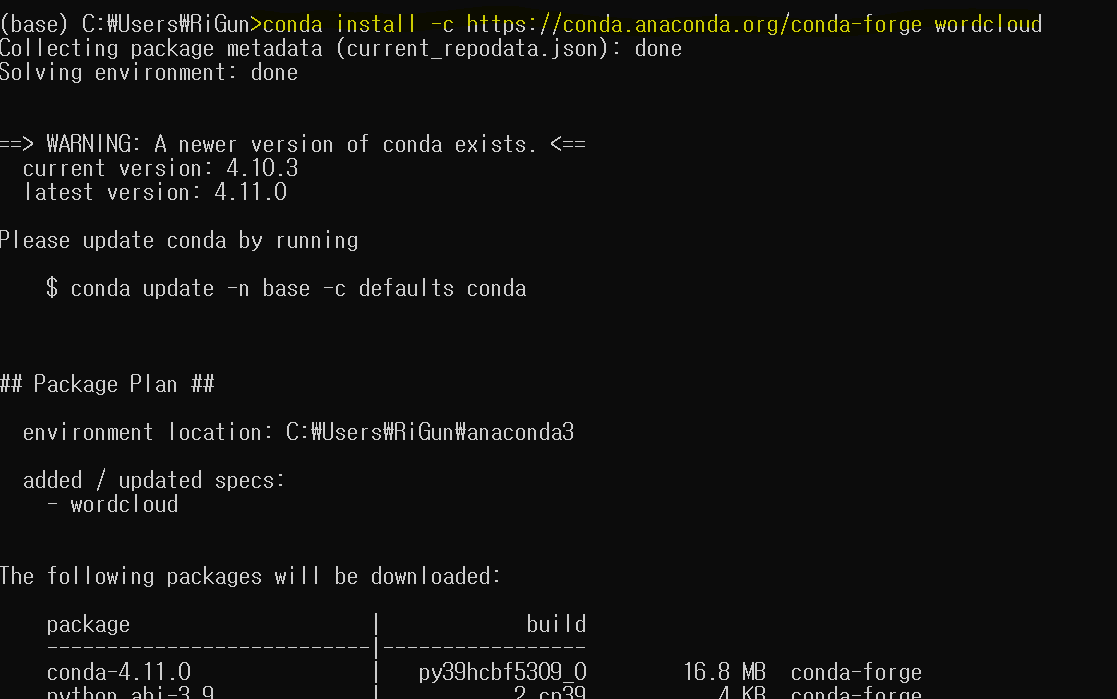 추가적으로 아나콘다 터미널에서 worcloud 설치