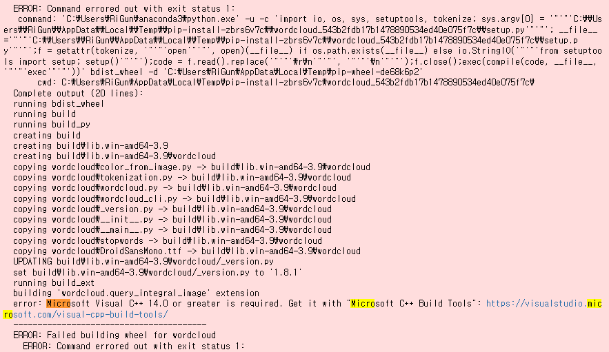 위 사진의 노란 밑줄 처럼https://visualstudio.microsoft.com/visual-cpp-build-tools/파이썬에서 c로 만들어진 확장모듈을 컴파일하기 위해 c 컴파일러가 필요하기때문에,