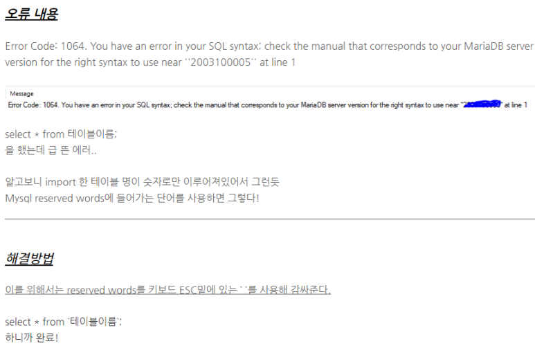 여러가지 에러가 있고 원인이 있겠지만 나의 경우 테이블명을 ` ` 로 묶어주지 않았다
