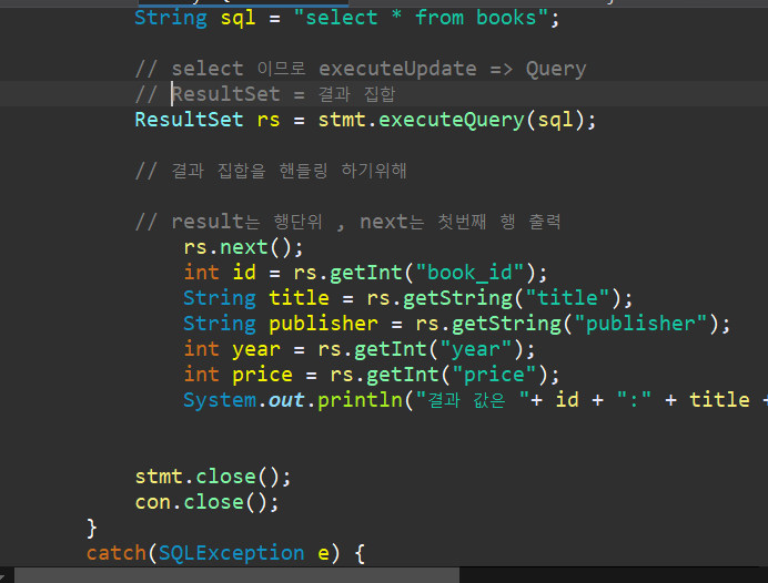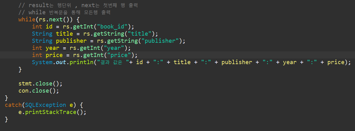 따라서 모든행을 출력하기위해 rs.next()를 반복문을 사용하여 모든행을 출력해보자