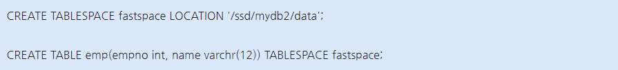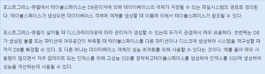 PostgreSQL 공식문서는 아래와 같이 정의하고 있다.https://www.postgresql.kr/docs/9.6/manage-ag-tablespaces.html