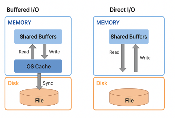 PostgreSQL은 전통적으로 모든 I/O를 운영 체제의 페이지 캐시(Page Cache)를 사용하는 Buffered I/O 방식으로 처리합니다.