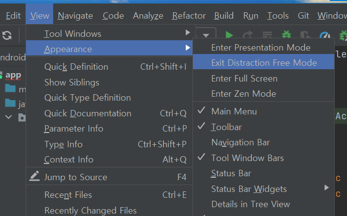View - Appearance 에 들어가서 메인메뉴 툴바 등 숨기거나 표시할 수 있다