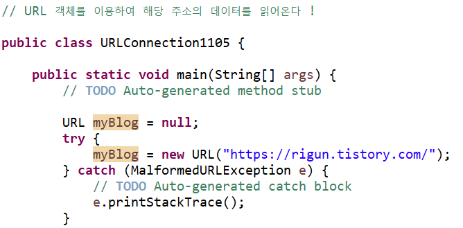 1. URL 객체 생성 , try catch 사용하여 URL 객체에 사용자가 지정한 주소 입력