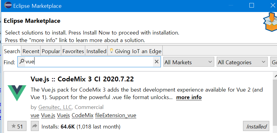 이클립스에서는 Vue 가 자동지원이 안되기 때문에 마켓을 통해 설치하자