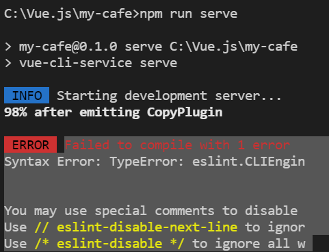 기존 사용하던 Vue 프로젝트를 노트북에 import 해서 서버를 키던중 위와 같은 에러가 발생했다.