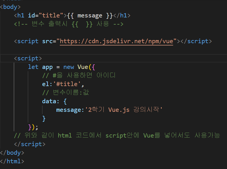 Vue.js 는 HTML 코드 내 body 안에 작성 할 수 있다,