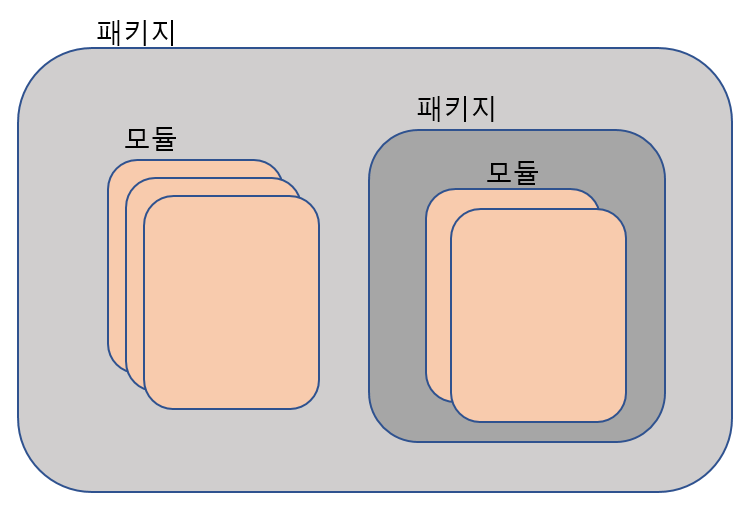 패키지는 모듈들의 컨테이너로서 패키지 안에는 또다른 서브 패키지를 포함할 수도 있다. 파일시스템으로 비유하면 패키지는 일반적으로 디렉토리에 해당하고, 모듈은 디렉토리 안의 파일에 해당한다.