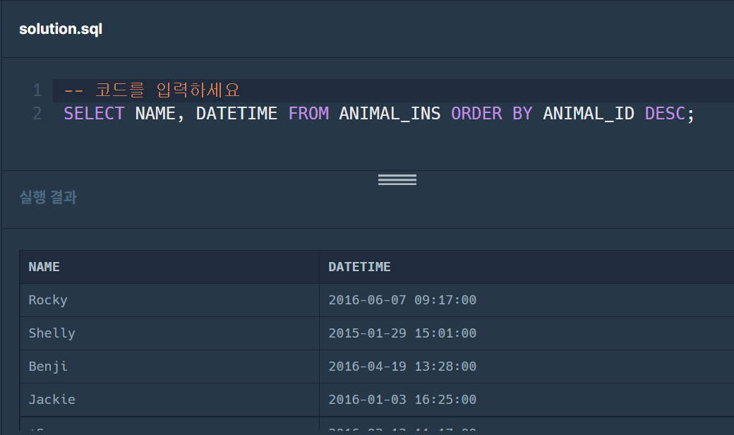 모든 칼럼중 NAME, DATATIME 칼럼을 조회하는데 단, ANIMAL_ID 칼럼은 역순으로 보여주도록 만들어라.