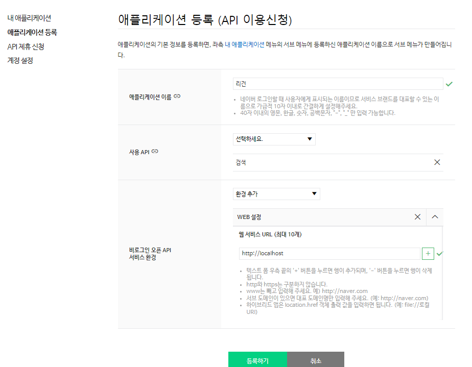 시작하려면 네이버 API에 자신의 정보를 등록해야 한다 !